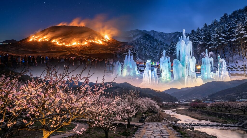 A3: 화려한 색감을 원하신다면 청양 알프스마을의 야간 조명 아래 얼음 분수를, 장엄하고 역동적인 사진을 원하신다면 제주 들불축제의 오름 불놓기 장면을 추천합니다. 광양 매화마을은 새벽 안개가 낄 때 몽환적인 사진을 얻을 수 있습니다.