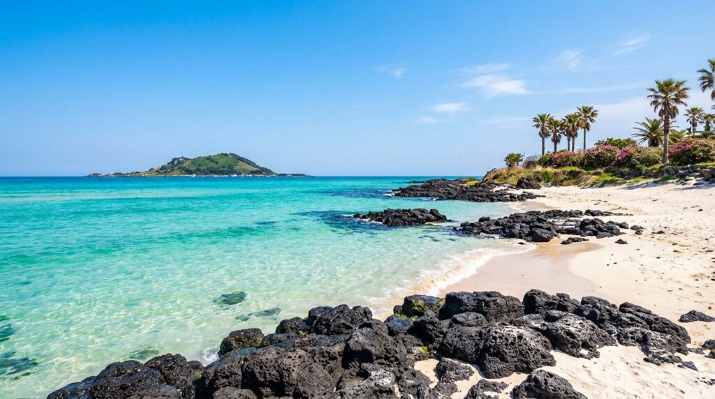 제주 공항에서 서쪽으로 약 1시간 정도 달리면 나타나는 협재 해수욕장은 명실상부 제주를 대표하는 해변입니다. 이곳의 가장 큰 매력은 바다 건너 손에 잡힐 듯 떠 있는 ‘비양도’의 풍경입니다. 썰물 때가 되면 끝없이 펼쳐지는 하얀 모래사장과 얕은 수심의 바다가 어우러져 아이들과 함께하기에도 최적의 장소입니다. 바로 옆에 위치한 금능 해수욕장은 협재보다 조금 더 한적한 분위기를 자아내며, 야자수가 늘어선 산책로는 마치 동남아시아의 휴양지에 온 듯한 착각을 불러일으킵니다.