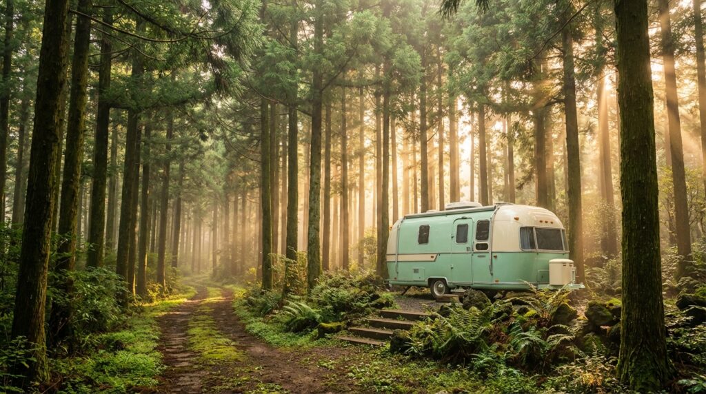 - 꿀팁: 비가 온 다음 날 방문하면 바닥에 고인 물에 비친 편백나무의 반영이 기막힌 장관을 연출합니다. 입구의 민트색 트레일러는 최고의 포토존입니다.