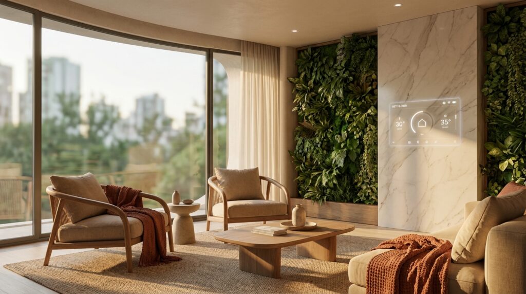 자연과의 연결을 강조하는 바이오필릭 디자인은 더욱 깊숙이 주거 공간에 침투합니다. 단순히 식물을 배치하는 ‘플랜테리어’를 넘어, 벽면 전체를 코르크나 재활용 목재로 마감하거나 거친 질감의 석재를 사용한 아트월이 인기를 얻고 있습니다. 특히 2026년에는 화학 성분을 최소화한 천연 리넨과 유기농 면 소재의 소파 커버링이 필수적인 요소로 자리 잡을 것입니다.