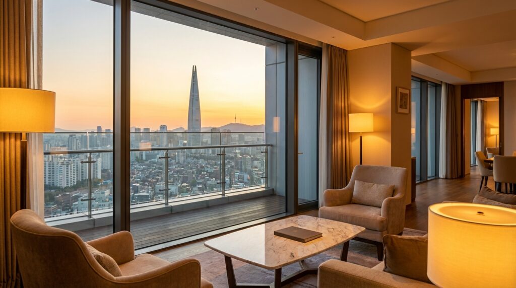 서울의 랜드마크인 롯데월드타워 76층에서 101층 사이에 위치한 시그니엘 서울은 ‘구름 위의 휴식’이라는 표현이 가장 잘 어울리는 곳입니다. 이곳의 매력은 단연 압도적인 조망권입니다. 모든 객실에서 서울 시내를 한눈에 내려다볼 수 있으며, 특히 해 질 녘 노을과 함께 펼쳐지는 야경은 그 어떤 예술 작품보다 감동적입니다.
