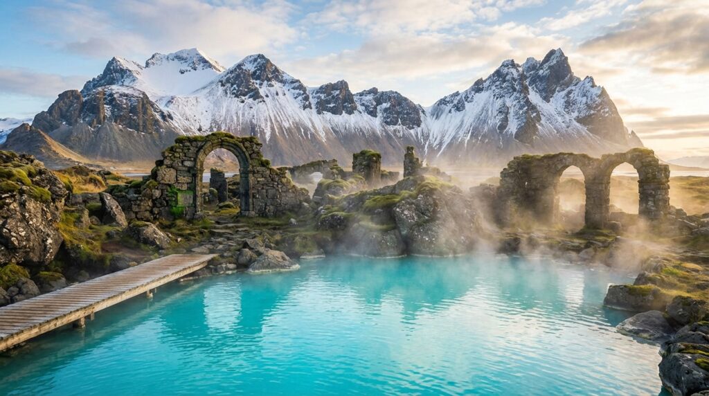 지구상에서 가장 초현실적인 풍경을 자랑하는 이곳은 용암 대지 사이에 형성된 거대한 유백색 온천입니다. 위치: 아이슬란드 그린다비크 인근(케플라비크 공항에서 20분). 특징: 풍부한 실리카와 유황 성분이 피부 미용에 탁월하며, 푸른빛의 물과 검은 바위의 대비가 예술적입니다. 비용: 예약제이며 약 8,000엔(약 8만원) 이상으로 다소 비싸지만 가치는 충분합니다. 팁: 실리카 머드 마스크를 얼굴에 바르고 맥주나 스무디를 즐기며 수영하는 경험을 놓치지 마세요.