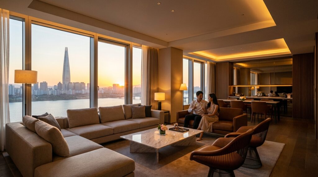 평일 기준 그랜드 디럭스 룸은 약 70만 원대부터 시작하며, 한강 뷰가 파노라마처럼 펼쳐지는 스위트룸은 150만 원 이상의 가격대를 형성하고 있습니다. 2026년 현재도 예약이 쉽지 않으니 최소 한 달 전 예약을 권장합니다.