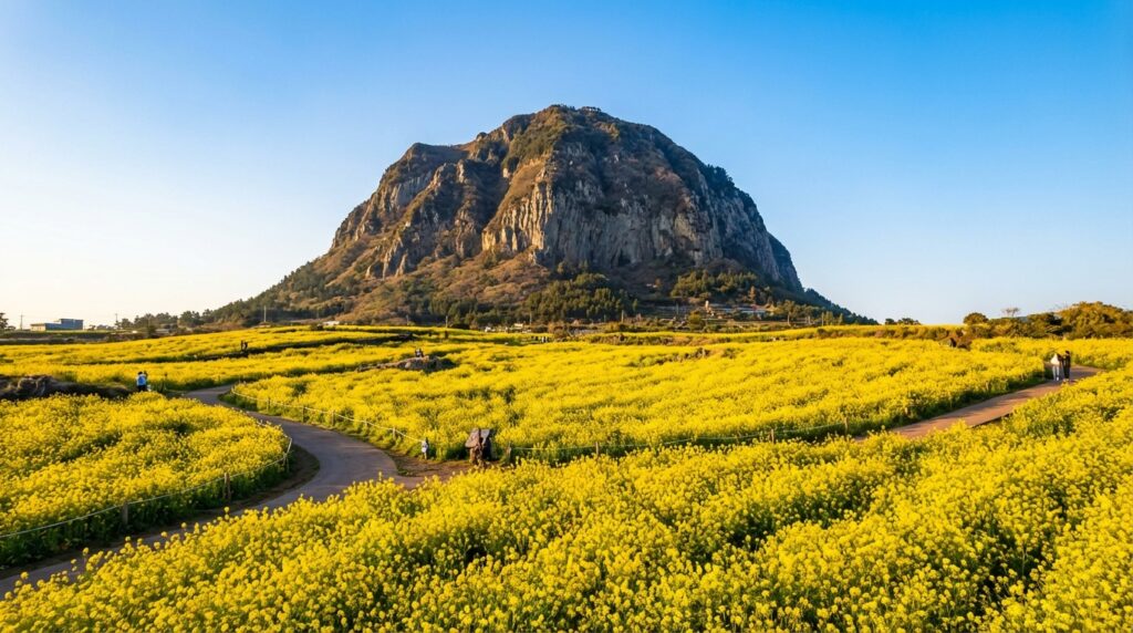 제주 공항에서 곧장 남쪽으로 달리면 서귀포의 상징인 산방산에 도착합니다. 2월 초순부터 산방산 아래는 이미 노란 유채꽃으로 가득 차 있습니다. 이곳의 유채꽃밭은 유료(인당 약 1,000원)로 운영되는 곳이 많지만, 산방산의 웅장한 바위산과 대비되는 노란 꽃물결은 인생 사진을 남기기에 더할 나위 없습니다. 이어지는 코스로는 용머리 해안을 추천합니다. 바닷속으로 들어가는 용의 머리를 닮은 이곳은 물때가 맞아야만 입장할 수 있는 신비로운 장소입니다. 방문 전 반드시 공식 인스타그램이나 관리소에 입장 가능 여부를 확인하세요. 저녁 식사로는 서귀포 올레시장을 방문해 제주산 은갈치 조림이나 흑돼지 크로켓을 맛보는 것을 추천합니다. 서귀포의 밤은 제주시보다 고요하며, 밤바다의 파도 소리를 들으며 첫날을 마무리하기 좋습니다.