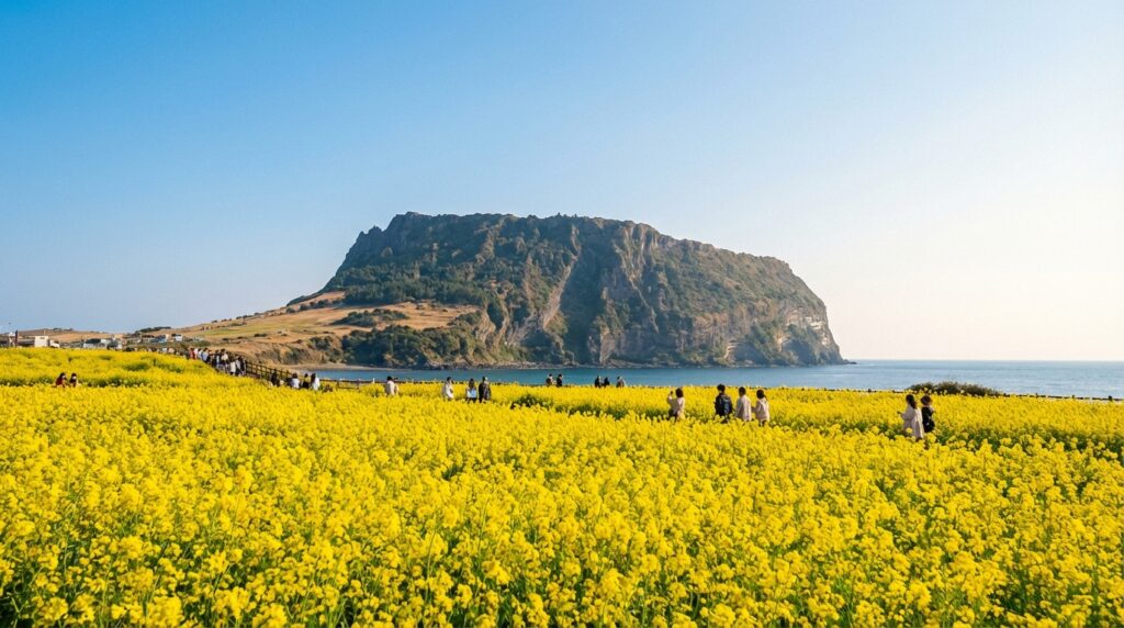 첫날은 제주의 동쪽을 공략합니다. 성산일출봉은 유네스코 세계자연유산으로 지정된 만큼 그 위용이 대단합니다. 하지만 단순히 정상에 오르는 것보다 더 중요한 것은 광치기 해변에서 바라보는 성산일출봉의 전경입니다. 물때를 잘 맞춰 가야 하는데, 간조 시간대에 맞춰 가면 바닷속에 숨겨져 있던 초록색 이끼 낀 바위들이 드러나며 환상적인 장관을 연출합니다. 이곳에서 성산일출봉을 배경으로 유채꽃 밭에서 사진을 찍는 것은 필수 코스입니다. 입장료는 성산일출봉 정상 코스 기준 성인 5,000원이지만, 무료 탐방 구간만으로도 충분히 아름다움을 만끽할 수 있습니다.