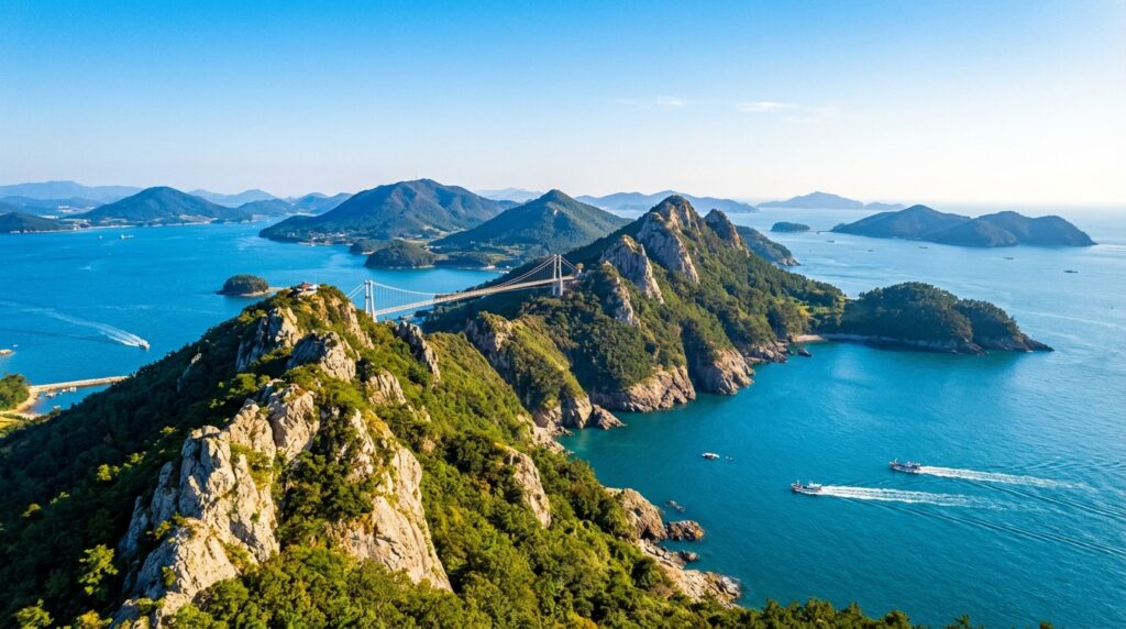 첫날은 사량도의 하이라이트인 지리망산(지리산)에서 옥녀봉으로 이어지는 종주 코스를 택해 보세요. 돈지마을에서 시작해 지리망산 정상을 거쳐 불모산, 그리고 대망의 옥녀봉 출렁다리까지 이어지는 이 코스는 약 4~5시간이 소요됩니다. 바다 한가운데 솟은 기암괴석의 능선을 걷다 보면 마치 구름 위를 걷는 듯한 착각에 빠지게 됩니다. 특히 옥녀봉 근처에 설치된 2개의 출렁다리는 짜릿한 스릴과 함께 남해의 다도해 풍경을 360도 파노라마로 감상할 수 있는 최고의 포토존입니다. 산행 중 마주하는 기암절벽은 자연이 빚은 조각품처럼 경이롭습니다.
